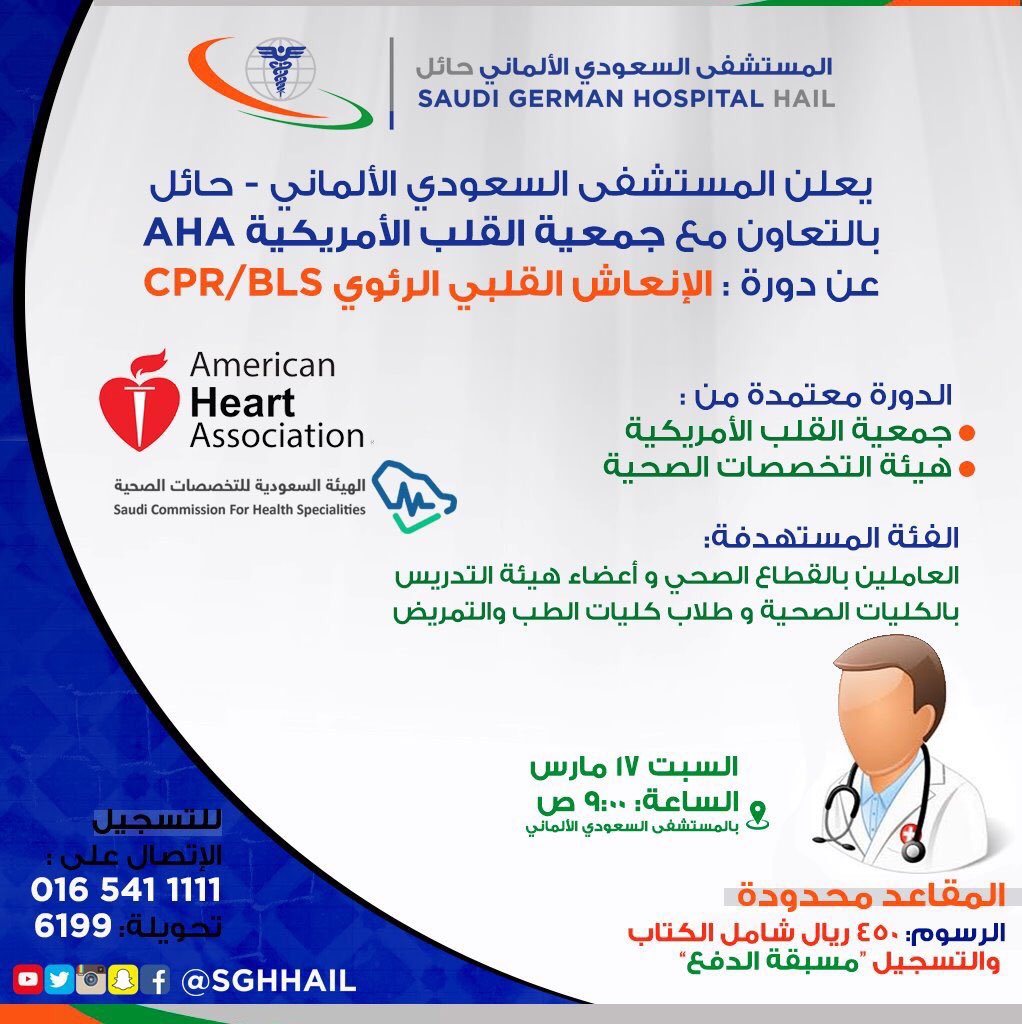 المستشفى السعودي الألماني حائل No Twitter يعلن المستشفى السعودي الالماني بحائل بالتعاون مع جمعية القلب الامريكية Aha عن دورة الانعاش القلبي الرئوي Cpr Bls للتسجيل 0165411111 تحويلة 6199 السعوديه حائل بقعاء القاعد الشنان جبه الجوف سكاكا