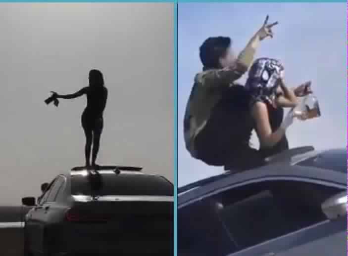 شاهد بالفيديو راعي بي ام يجاهر بالمعصية في السعودية برفقة فتاة ترقص فوق سقف السيارة