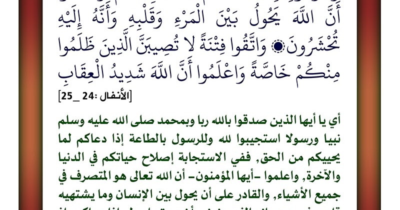 ي ا أ ي ه ا ال ذ ين آم ن وا اس ت ج يب وا ل ل ه و ل لر س ول إ ذ ا د ع اك م ل م ا ي ح ي يك م و اع ل م وا أ ن الل ه ي ح ول ب ي ن ال م ر ء و ق ل ب ه و أ ن ه إ ل ي ه ت ح ش ر ون تفسير الجلالين الأنفال 24